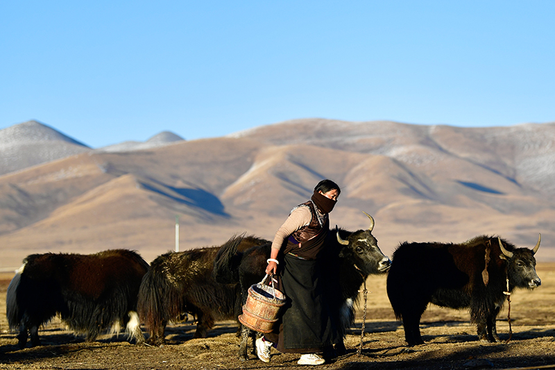 青海省玉树藏族自治州称多县珍秦镇二村牧民扎西德藏准备给牦牛挤奶(2020年10月28日摄)。新华社记者 张龙 摄