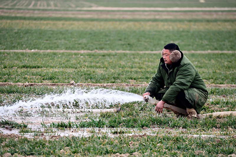 2月18日,在山东省菏泽市巨野县柳林镇,村民在麦田里浇水。新华社记者 郭绪雷 摄