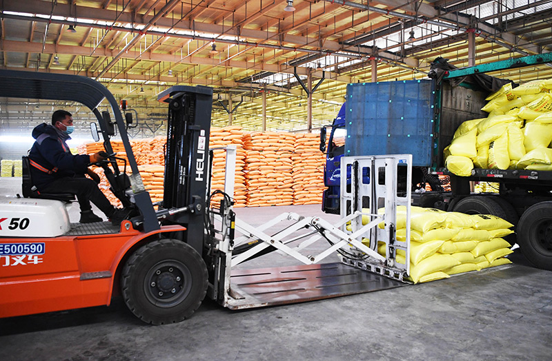 2月17日,工人在位于河南省安阳市汤阴县伏道镇的河南万庄安阳物流园装运储备化肥。新华社记者 张浩然 摄