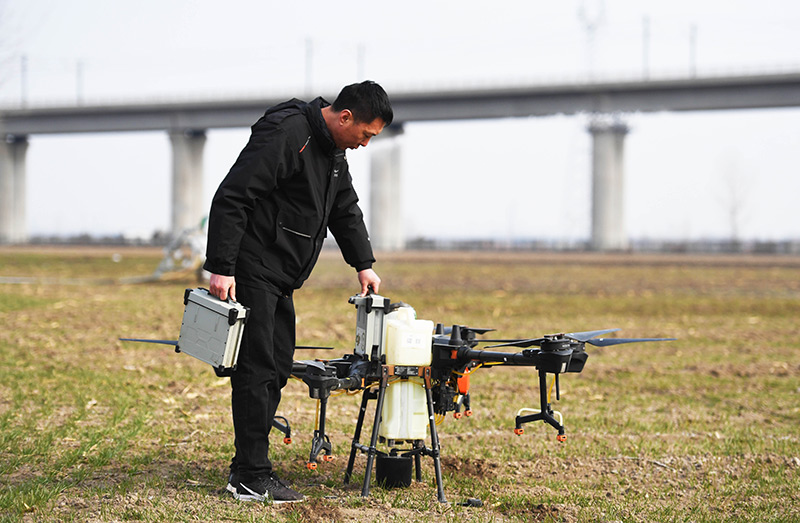 2月17日,在河南省安阳市汤阴县伏道镇,农技人员为植保无人机更换电池。新华社记者 张浩然 摄
