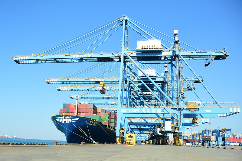 黄海碧波荡漾。岸边,高大的轨道吊呼啸往返,AGV来回穿梭,一个个集装箱被送到泊位旁,被桥吊抓取到300多米长的韩国现代“东京”轮上。