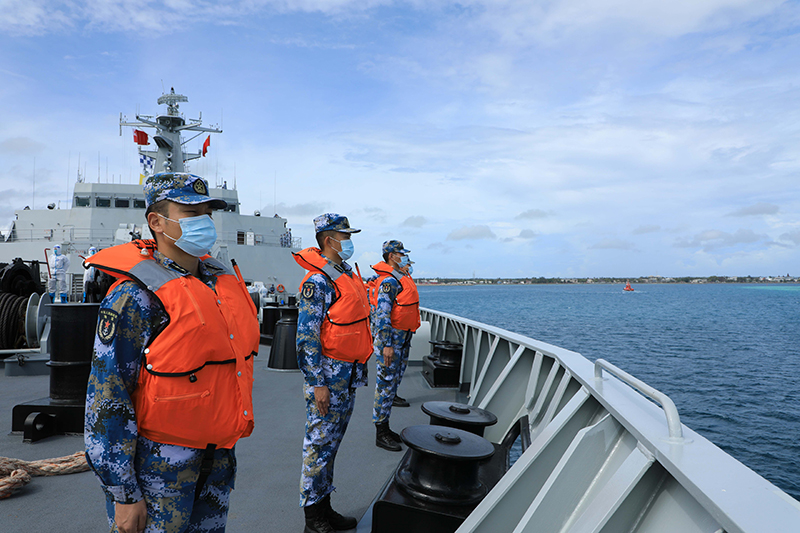 赴汤加执行运送救灾物资任务的中国海军舰艇编队五指山舰驶离努库阿洛法港时,官兵分区列队站坡(2月23日摄)。新华社发(薛成清 摄)