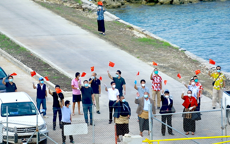 赴汤加执行运送救灾物资任务的中国海军舰艇编队驶离努库阿洛法港,当地政府官员和中国驻汤加使馆工作人员及华人代表前来送行(2月23日摄,视频截图)。新华社发(李孜 摄)