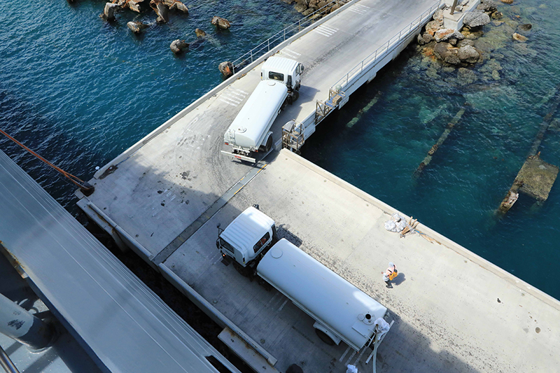 赴汤加执行运送救灾物资任务的中国海军舰艇编队五指山舰在努库阿洛法港给汤加补给淡水(2月20日摄)。新华社发(薛成清 摄)