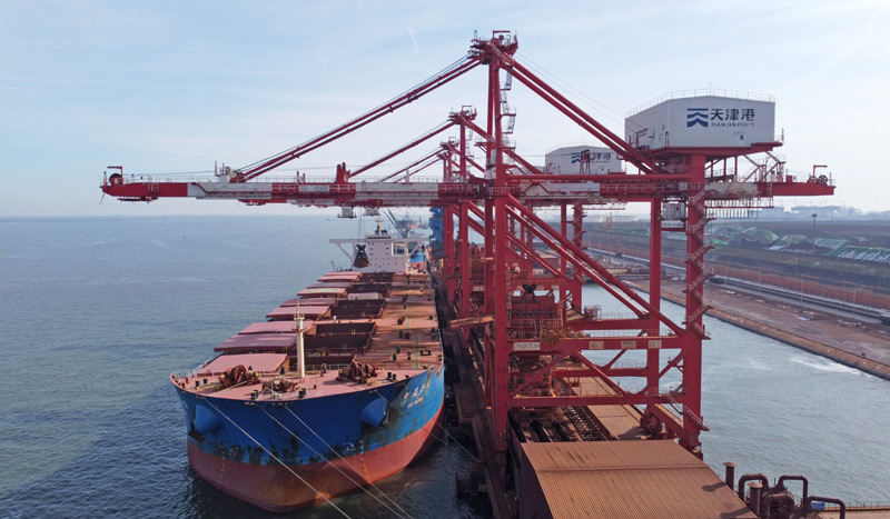 在天津港南疆港区26泊位,卸船机在进行卸货作业(1月28日摄,无人机照片)。新华社记者 赵子硕 摄
