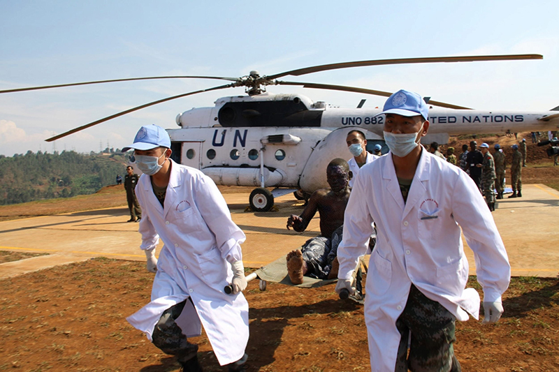2010年7月3日,中国赴刚果(金)维和医疗分队医护人员在刚果(金)南基伍省布卡武机场运送油罐车爆炸中的受伤者。新华社发(郭云飞 摄)