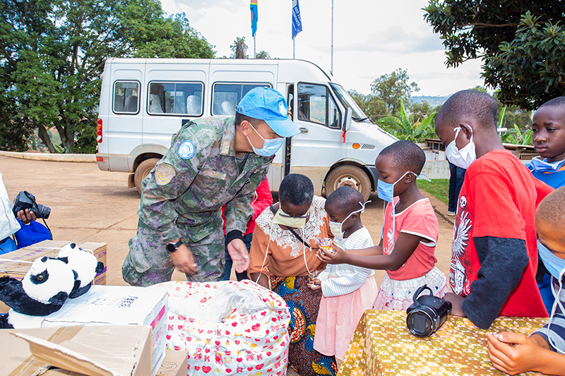 2021年6月1日,在刚果(金)东部城市布卡武的SOS儿童村,中国第24批赴刚果(金)维和医疗分队的队员把糖果分给孩子们。新华社发