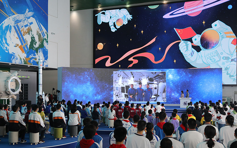 2021年12月9日,“天宫课堂”第一课开课,神舟十三号乘组航天员翟志刚、王亚平、叶光富在空间站进行太空授课。这是学生们在北京中国科技馆听课。新华社记者 金立旺 摄