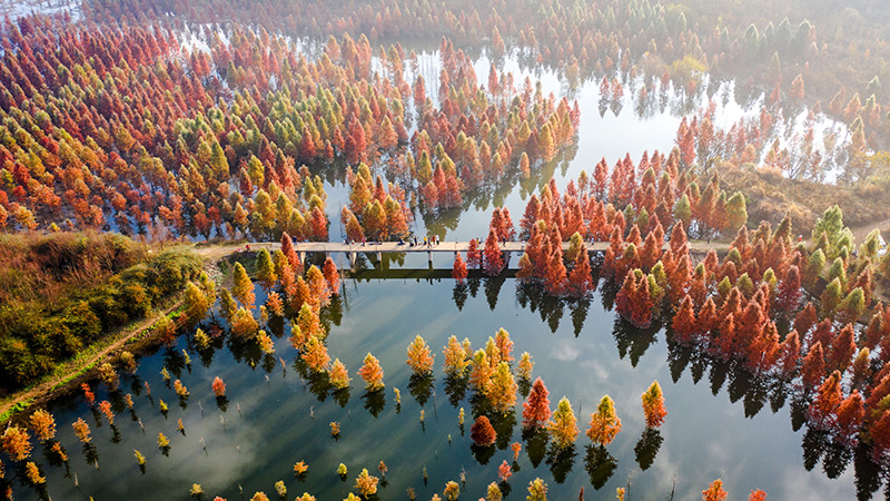 2021年12月10日拍摄的云南省昆明市的甸尾村水杉湿地一景(无人机照片)。新华社记者 胡超 摄