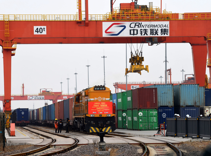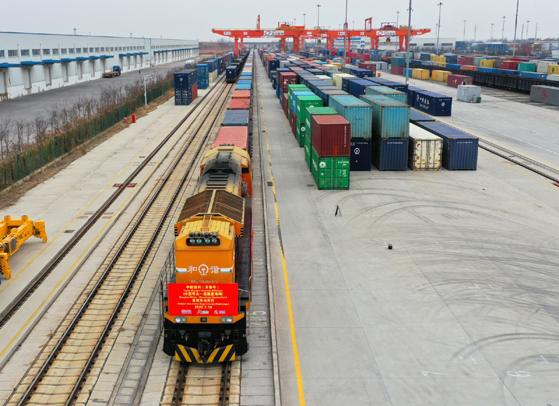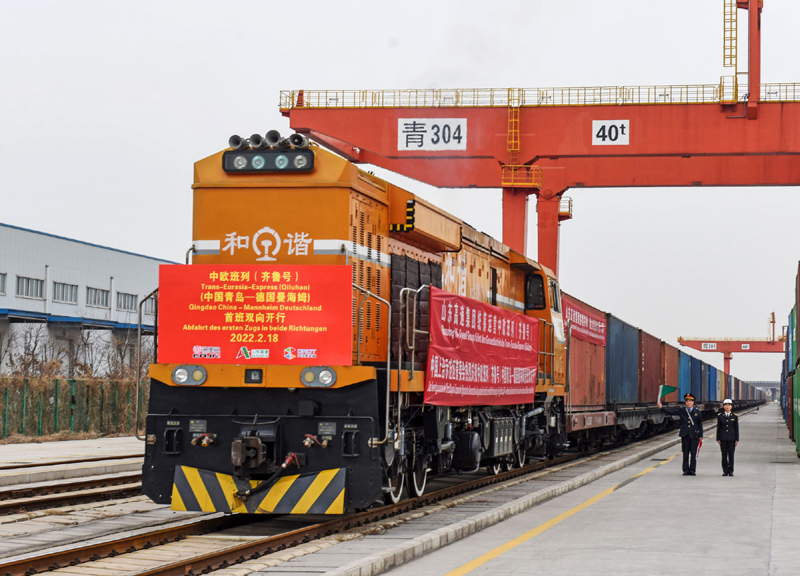 2月18日,中欧班列(齐鲁号)中国青岛—德国曼海姆双向对开首班列车从上合示范区青岛多式联运中心出发。新华社发(王昭脉 摄)