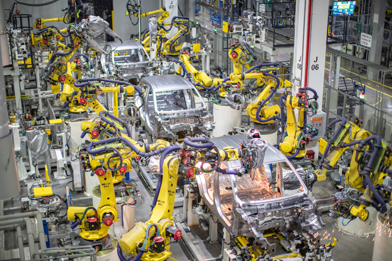 重庆一家新能源汽车企业使用智能化焊接机器人进行焊接作业(2021年4月2日摄)。新华社记者 黄伟 摄