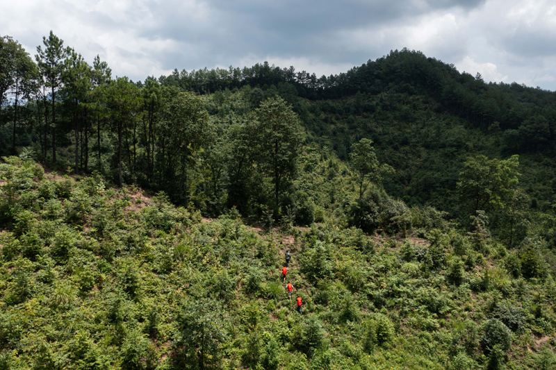 在浙江省杭州市临安区太湖源镇上阳村重阳坞,志愿者在“碳中和林”进行日常巡查(2021年7月20日摄,无人机照片)。新华社记者 徐昱 摄