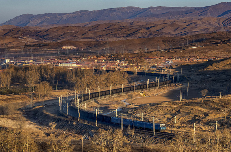 2021年12月23日,一列万吨煤炭列车行驶在内蒙古乌兰察布市卓资县境内。新华社发(纪恩泉 摄)