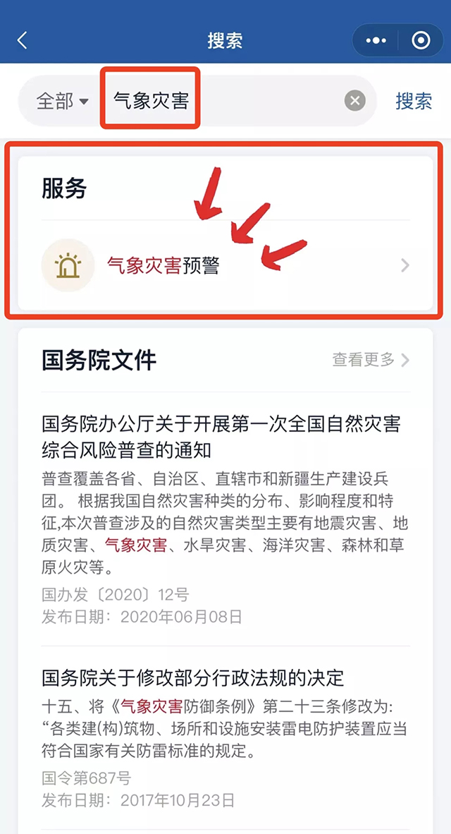 在“国务院客户端”小程序中搜索“气象灾害”,打开“气象灾害预警”服务。