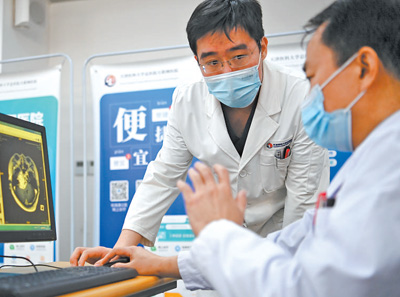 近年来,天津医科大学总医院已开通线上复诊、专病管家、数字胶片“云影像”等近20项线上服务。图为医生通过电脑调阅患者影像检查结果进行商讨。新华社记者 李然 摄