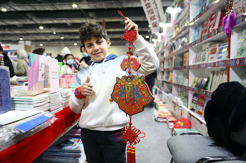 2月4日,在埃及开罗举办的开罗国际书展上,一名男孩在中国图书展位展示春节装饰。新华社发(艾哈迈德·戈马 摄)