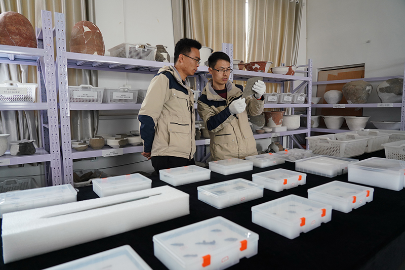 考古队员在研究河北雄安新区南阳遗址的出土器物(2021年3月19日摄)。新华社记者 牟宇 摄
