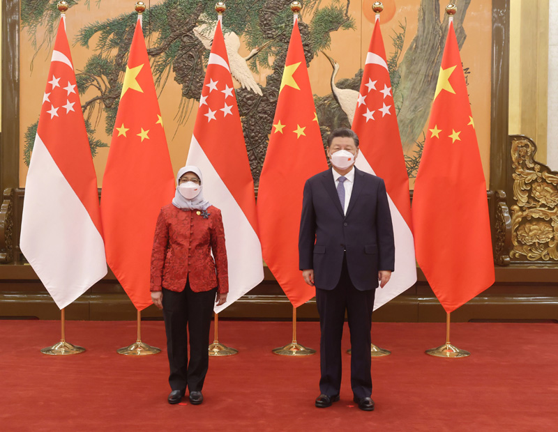 2月6日上午,国家主席习近平在北京人民大会堂会见来华出席北京2022年冬奥会的新加坡总统哈莉玛。新华社记者 丁林 摄