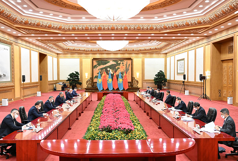 2月5日上午,国家主席习近平在北京人民大会堂会见来华出席北京2022年冬奥会开幕式的哈萨克斯坦总统托卡耶夫。新华社记者 申宏 摄