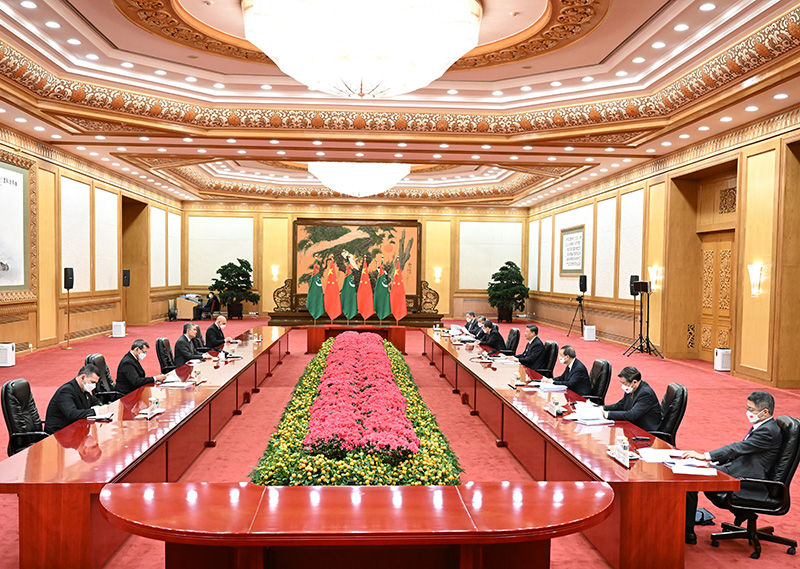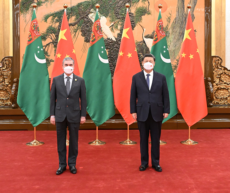 2月5日上午,国家主席习近平在北京人民大会堂会见来华出席北京2022年冬奥会开幕式的土库曼斯坦总统别尔德穆哈梅多夫。新华社记者 申宏 摄