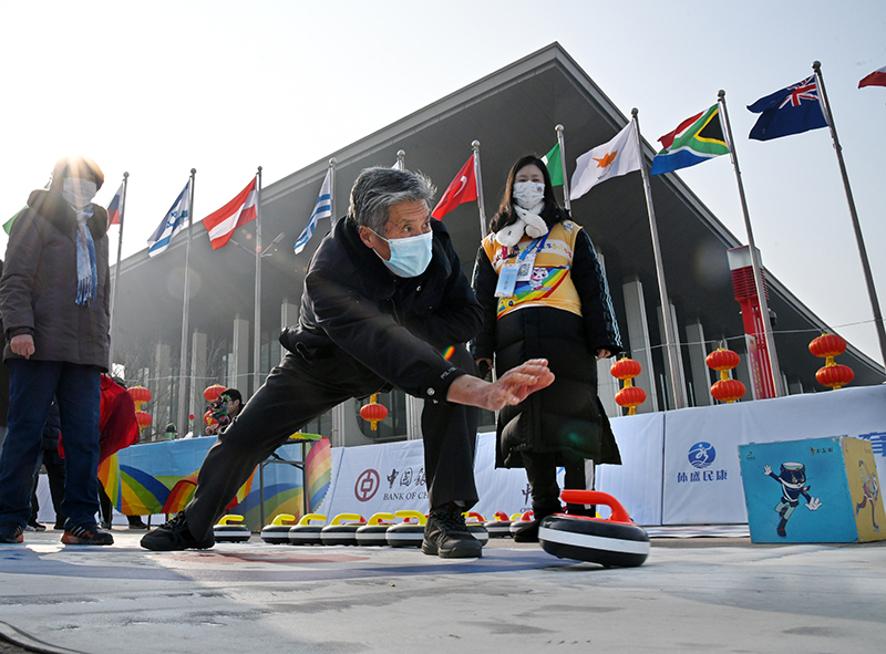 2022年1月8日,在山东青岛,一位市民在中国冰雪大篷车百场巡回青岛站活动中体验旱地冰壶。新华社记者 李紫恒 摄