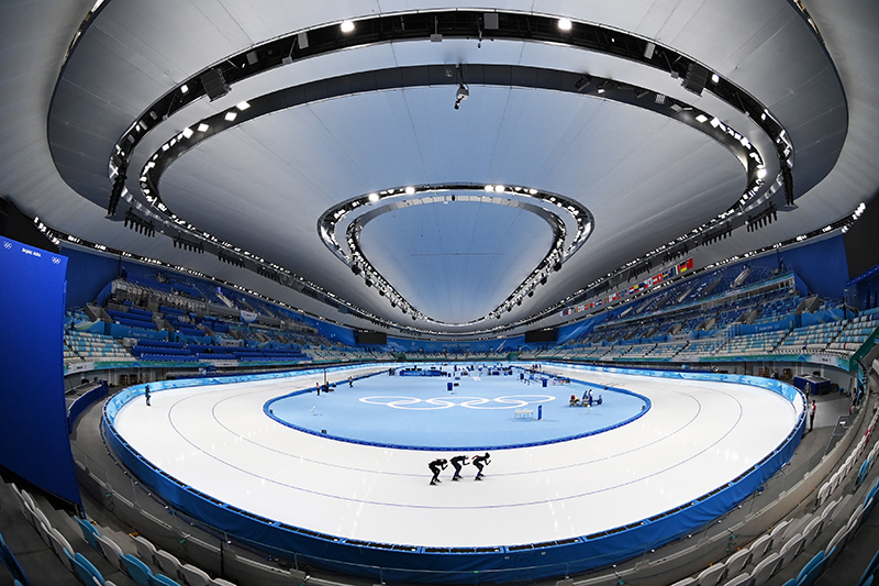 2022年1月30日,运动员们在国家速滑馆“冰丝带”进行训练,备战北京冬奥会比赛。新华社记者 武巍 摄