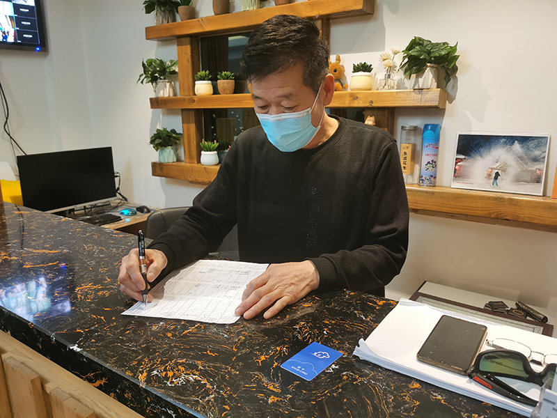 这是2021年1月8日,在黑龙江雪乡,民宿老板樊兆义在柜台前核对住客信息。新华社记者 王君宝 摄