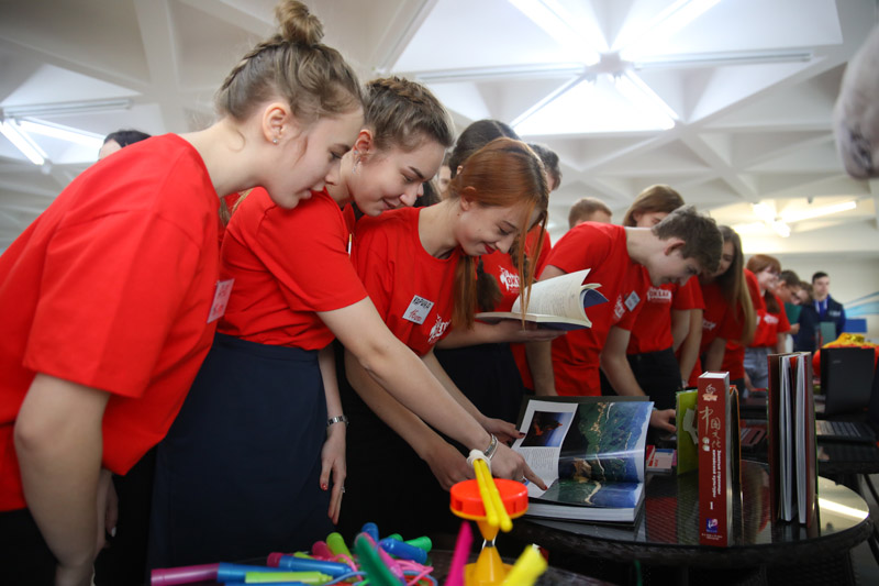 2019年1月16日,在俄罗斯符拉迪沃斯托克的“海洋”全俄儿童中心,俄罗斯青年观看中国政府赠送的礼物。新华社记者 吴刚 摄