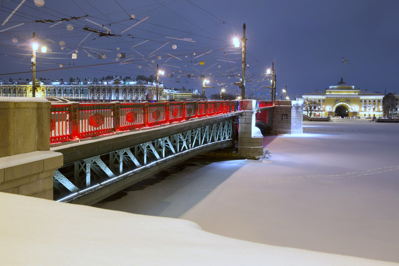 2022年1月31日傍晚,俄罗斯圣彼得堡地标性建筑冬宫桥亮起“中国红”,迎接中国农历虎年春节的到来。新华社发(莫京娜 摄)