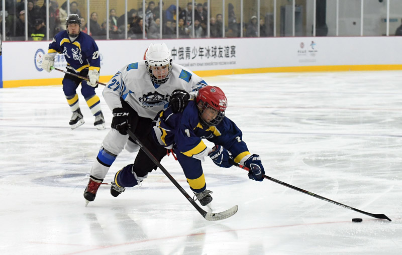 2019年12月10日,中俄双方队员在中国天津举行的第二届中俄青少年冰球友谊赛中拼抢。新华社记者 马平 摄