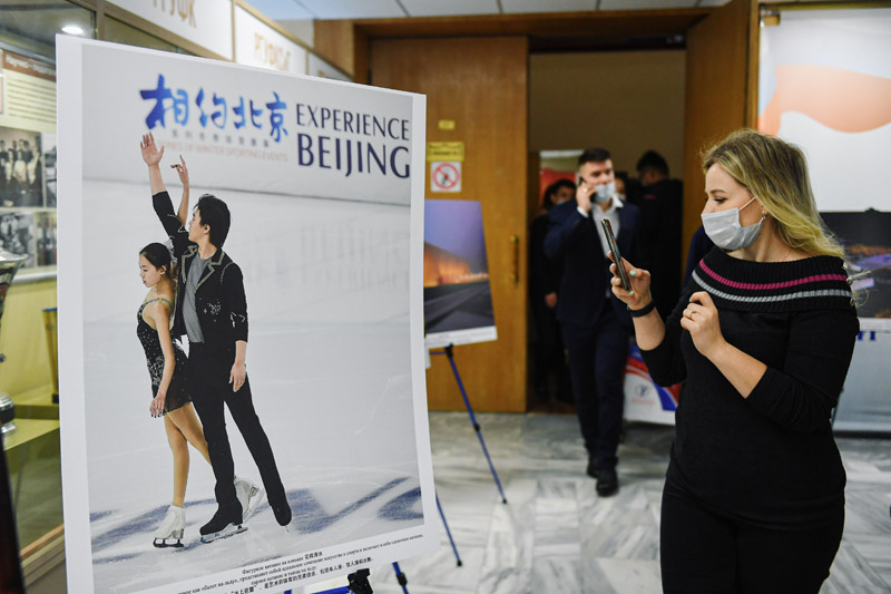 2022年1月21日,一名女子在俄罗斯莫斯科观看“北京冬奥会,一起向未来”冬奥图片展。新华社发(叶甫盖尼·西尼岑 摄)