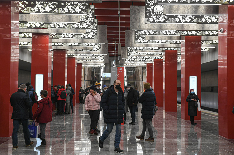 2021年12月7日,在俄罗斯首都莫斯科,乘客走在由中国铁建承建的莫斯科地铁第三换乘环线西南段米丘林大街站内。新华社发(叶甫盖尼·西尼岑 摄)