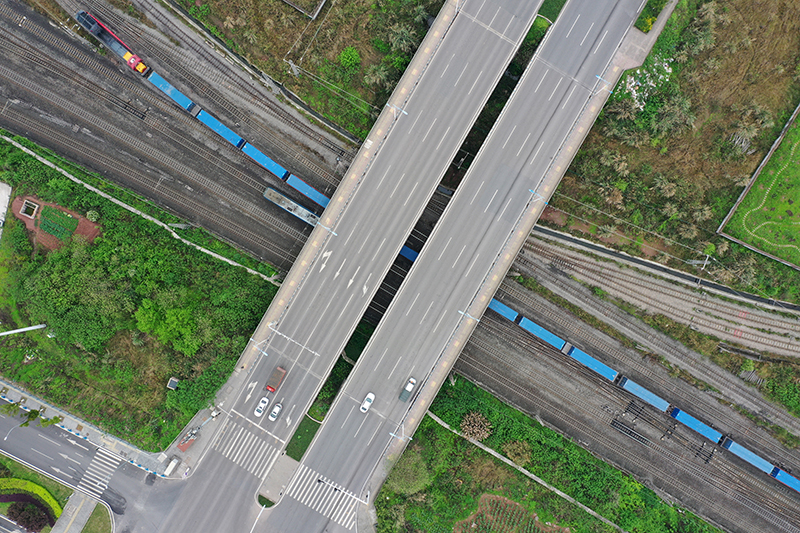 2021年3月19日,中欧班列(渝新欧)十周年纪念专列从重庆一座公路桥下穿过(无人机照片)。新华社记者 唐奕 摄