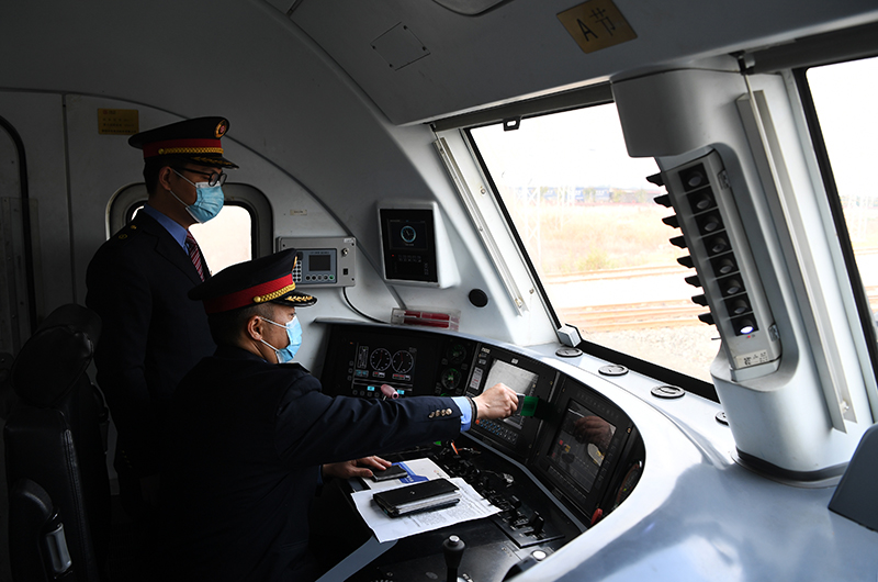 在重庆机务段兴隆场北折返所,中欧班列首发司机江彤(前)在值乘机车上做发车前的准备(2021年1月28日摄)。新华社记者 王全超 摄