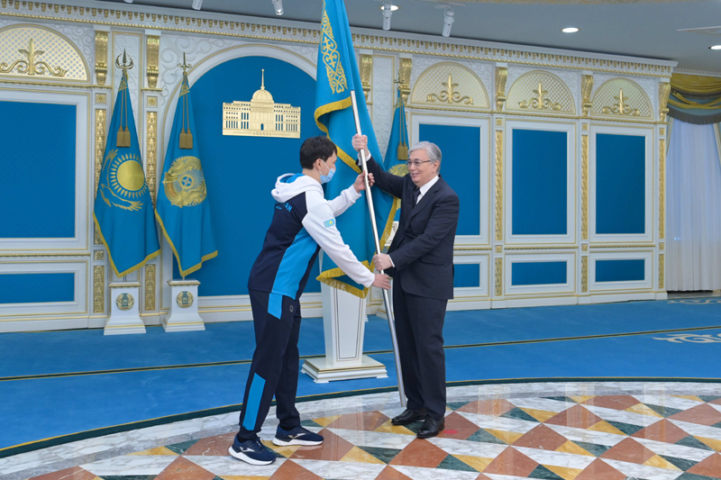 据哈总统府网站消息,托卡耶夫当天在总统府接见参加北京冬奥会的哈萨克斯坦代表团,并将哈萨克斯坦国旗交到代表团成员手中。