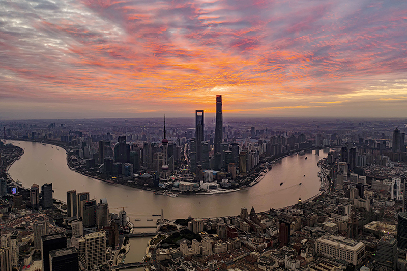 2022年1月1日拍摄的上海陆家嘴朝霞(无人机照片)。新华社发(杨帆 摄)