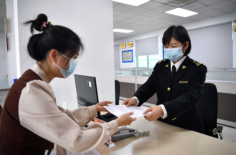 2022年1月1日,海关工作人员(右)发放海南首份RCEP原产地证书。新华社记者 郭程 摄