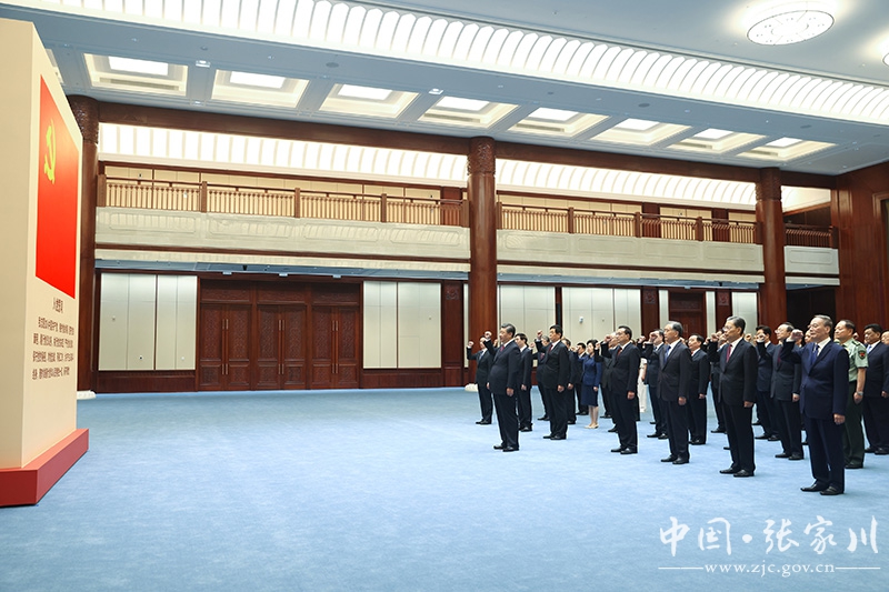 6月18日,党和国家领导人习近平、李克强、栗战书、汪洋、王沪宁、赵乐际、韩正、王岐山等在中国共产党历史展览馆参观“‘不忘初心、牢记使命’中国共产党历史展览”。这是参观结束后,习近平带领党员领导同志一起重温入党誓词。新华社记者 鞠鹏 摄