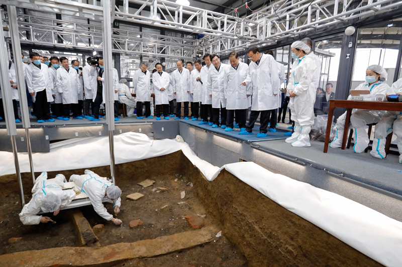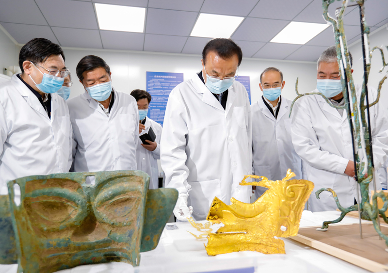 一座巨大的灰色钢结构“考古大棚”内,身着防护服的考古工作者在发掘坑内趴在悬空的操作台上,小心翼翼地工作着。4月19日,李克强来到四川广汉三星堆考古发掘现场。现场负责人介绍,三星堆此次考古发掘又有新的重大发现。总理认真听取情况介绍并仔细察看发掘现场后说,看到这么多学科的年轻学者,在今天这样一个快速发展的时代,仍然专注于考古事业,心还是静的,这很不容易。你们在现代社会发掘古代遗址,实际上是在发现和传承中华文化的根基。从早年的殷墟发掘,到二里头,再到今天三星堆的大面积发掘,你们要仔细比较、研究其中的关系。李克强说,考古技术发展到今天,已经不光局限于考古专业单一领域,而是许多学科协同配合的结果。要开放性利用现代科技手段,在发掘中进行新的探索、不断取得新的发现。考证文化根脉目的是为了鼎新,中华文明绵延数千年,通过考古使积淀深厚的优秀文化不断发扬光大。要发掘好、保护好、研究好三星堆遗址这笔丰厚的历史文化遗产。 |