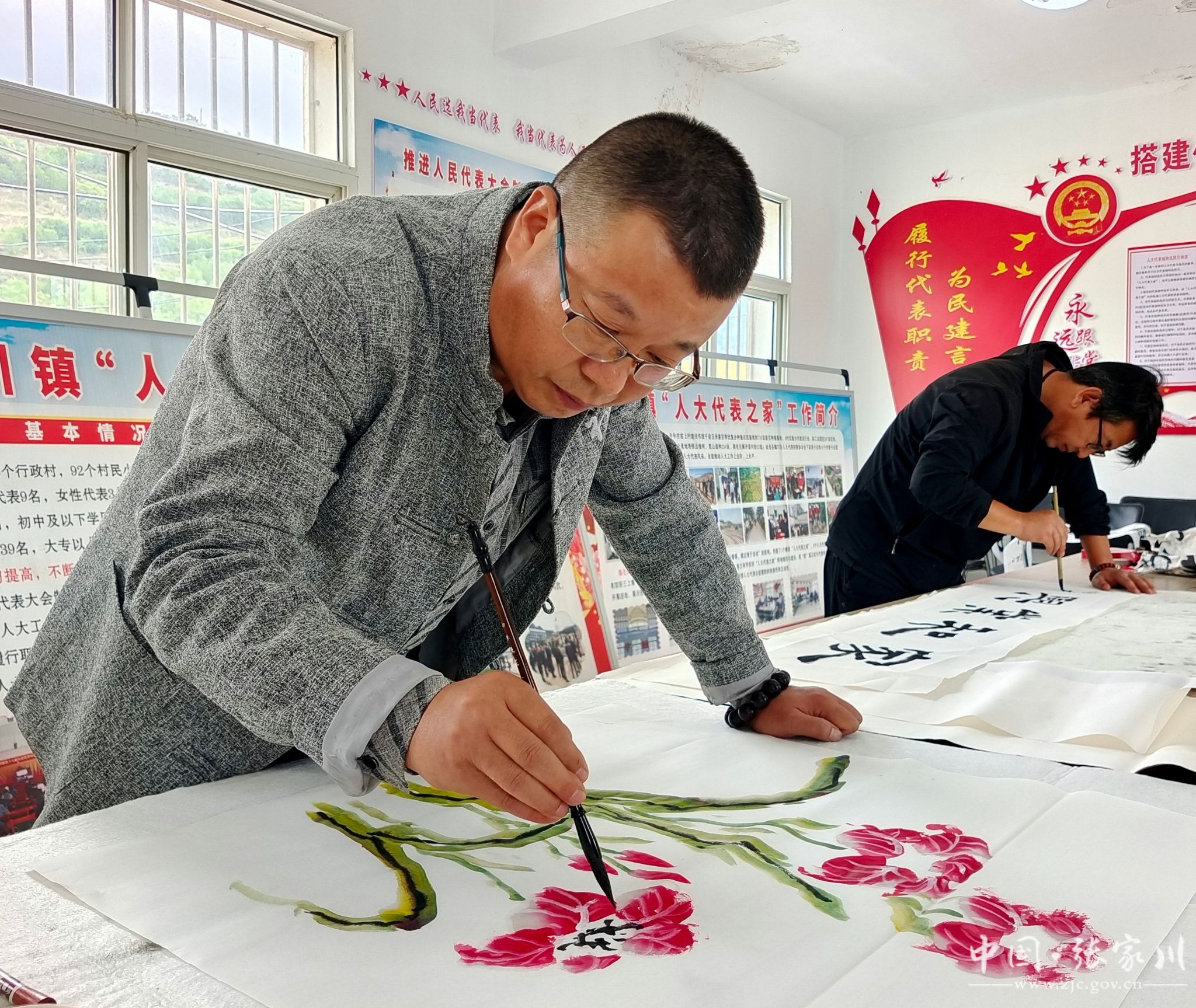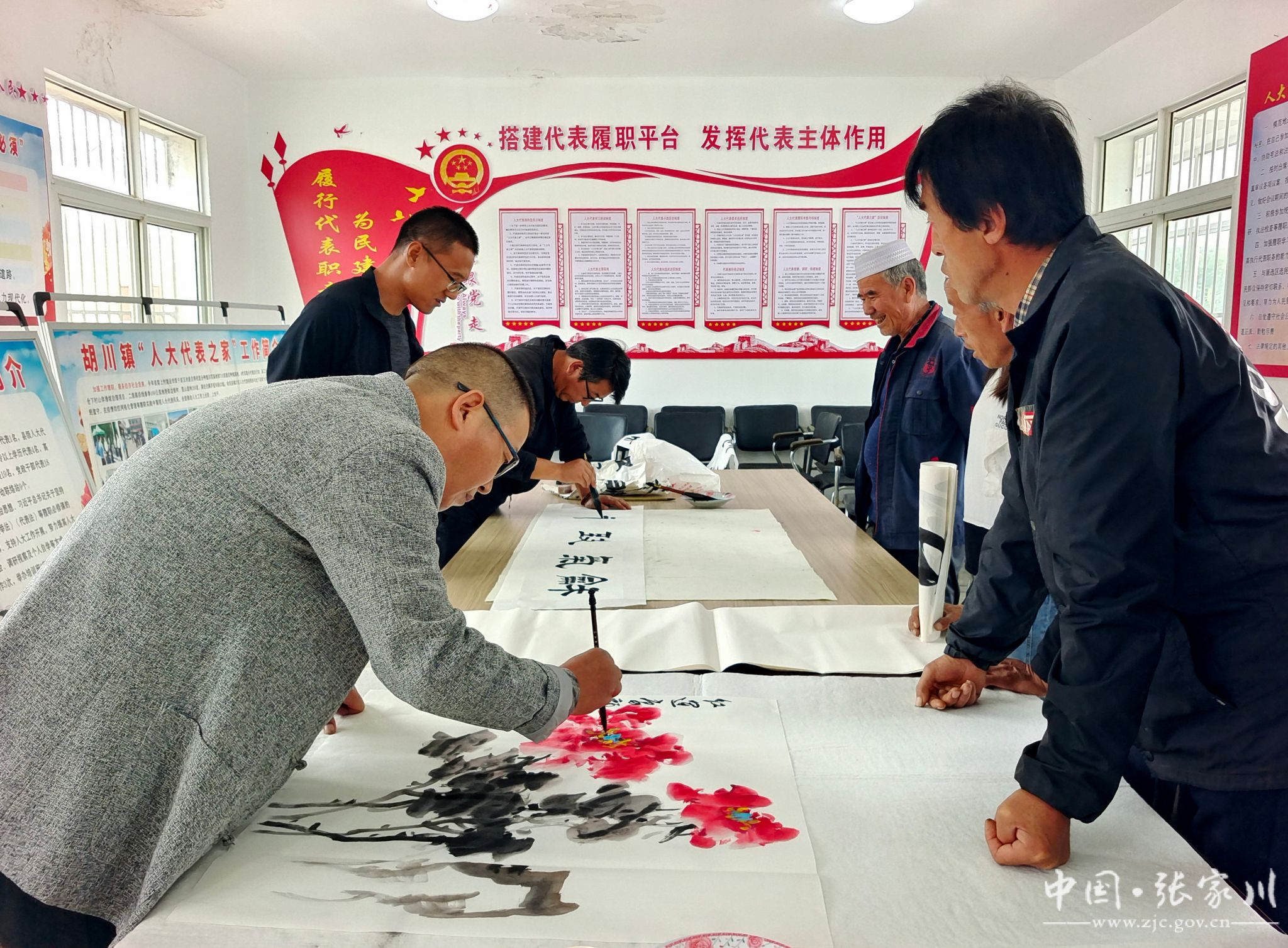 在胡川镇新时代文明实践所,书画爱好者围绕铸牢中华民族共同体意识主题,聚焦胡川镇各民族团结奋斗的发展历程,即兴开展书画创作。活动现场,墨香弥漫,书画爱好者以丹青显真情,以翰墨表深意,一幅幅饱含民族团结深情的妙笔跃然纸上,与群众共同感受中华传统文化的魅力,提高民族团结进步意识。